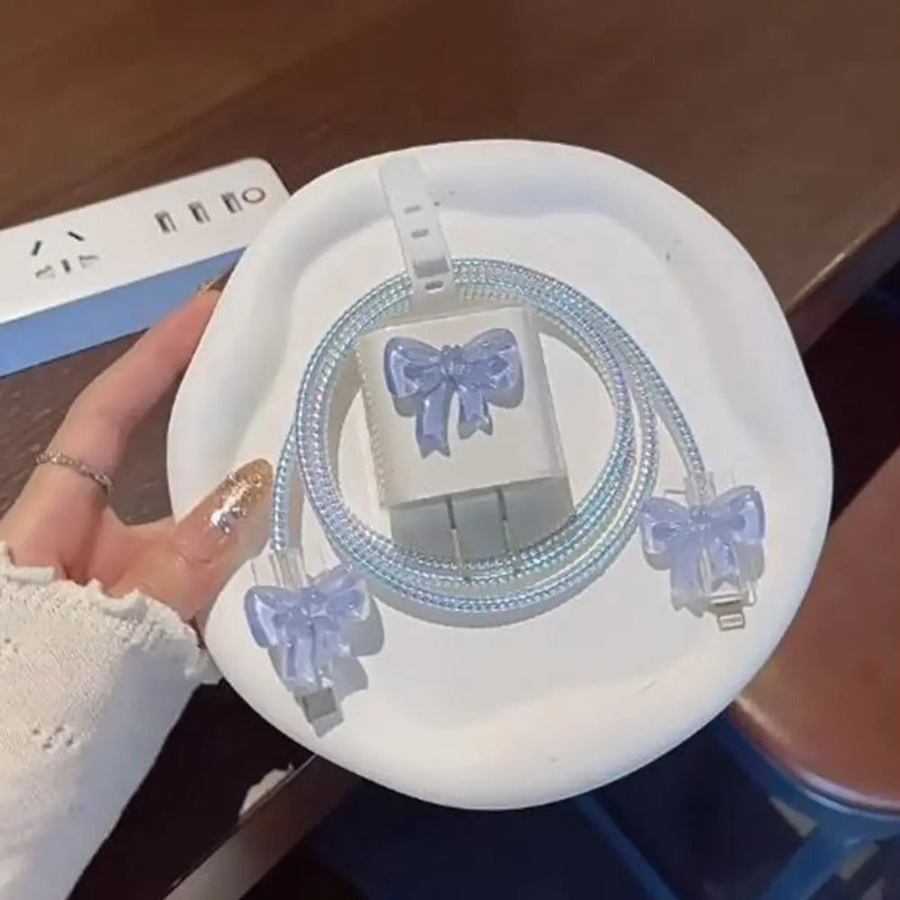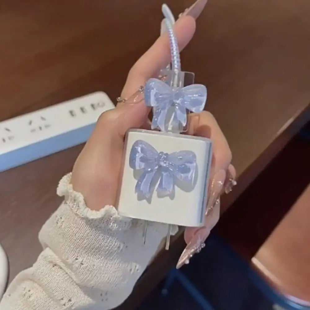 Dress up your charging setup with the Crystal Bow Charge Kit – Ice Blue Edition. This charming set includes a fast‑charge wall adapter protector and matching braided cable clips, each adorned with a translucent, glitter‑infused bow in a shimmering ice‑blue hue. The semi‑rigid EVA cover snaps snugly around your adapter, preventing scratches and bumps, while the durable spiral cable clips secure your USB‑C and Lightning cable ends to guard against fraying. An adjustable silicone strap keeps your coiled cable tidy whether it’s in your desk drawer or on the go.