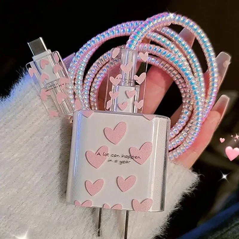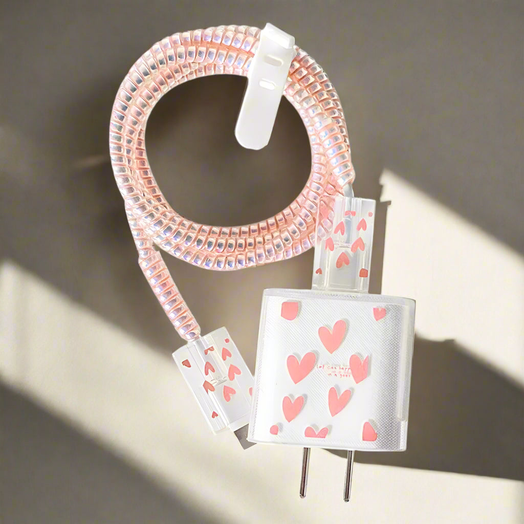 eep your charger and cable safe in style with the Sweetheart ChargeGuard Pouch. This girly, pocket-sized case is printed with hand-drawn pink hearts on a glossy white background and snaps securely around your USB-C or Lightning adapter and matching spiral-braided cable. Its semi-rigid EVA shell shields against bumps and spills, while the soft-lined interior prevents scratches. A handy cable clip keeps your cord neatly coiled—perfect for tossing in your purse, tote, or backpack with flair