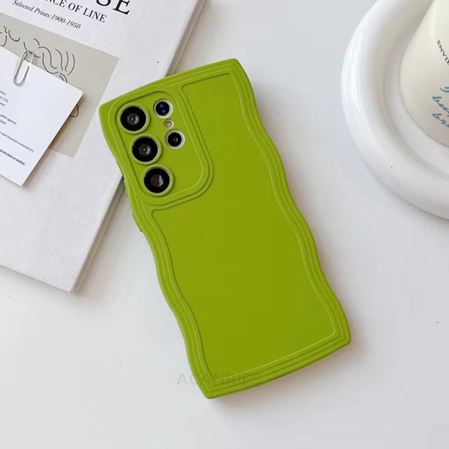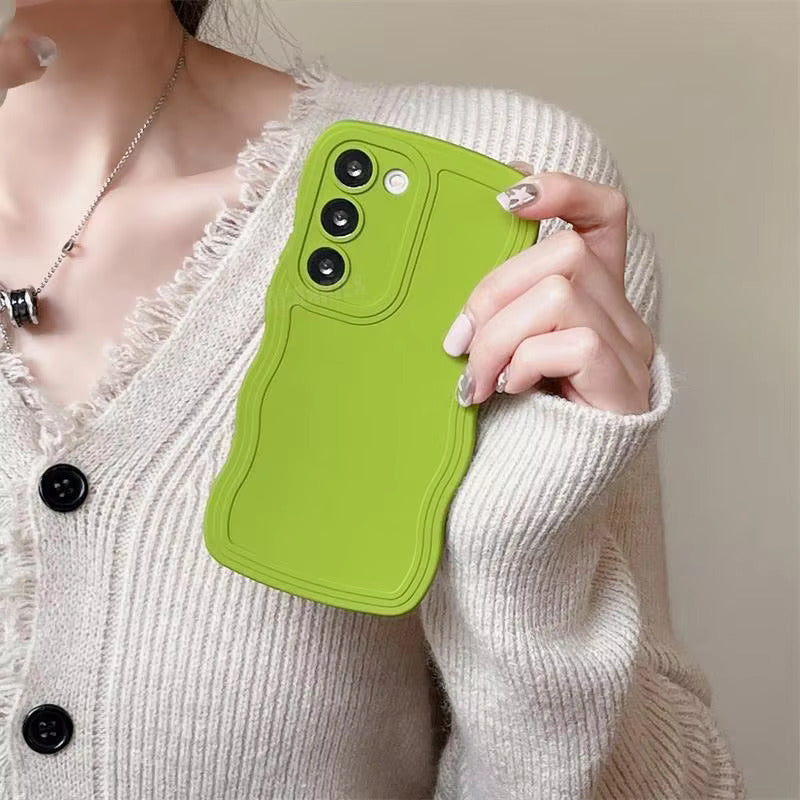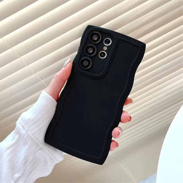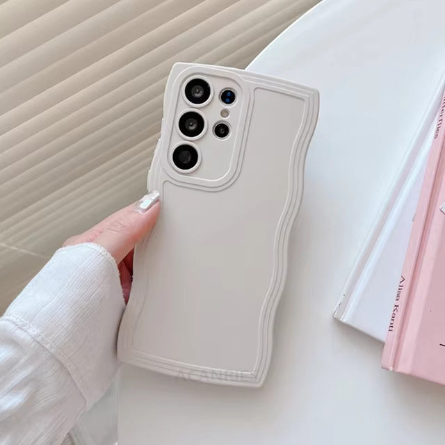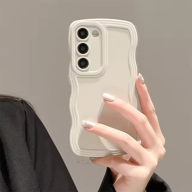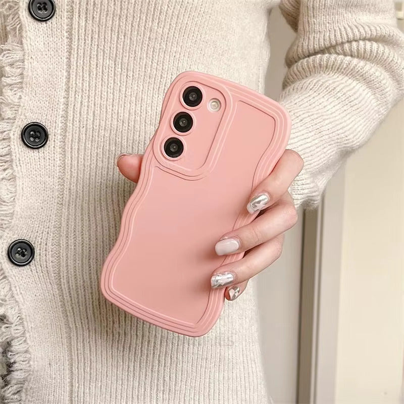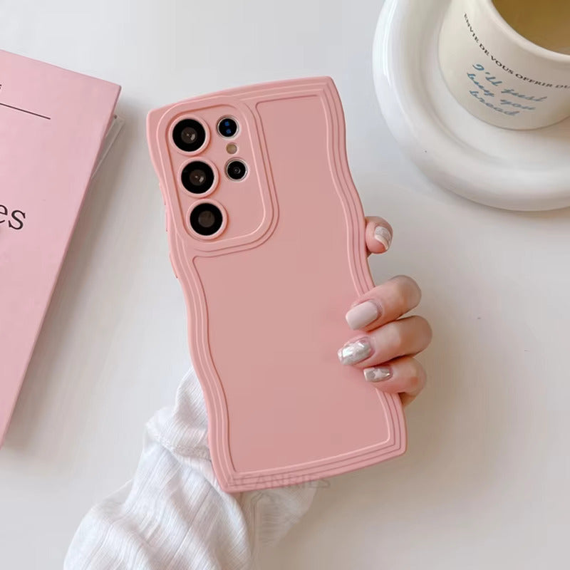 The phone case showcases a sleek, minimalist design in a soft blush pink color. Its most distinctive feature is the wavy edge along the perimeter, giving the case a unique, playful appearance. The case is designed to fit snugly around a phone with a triple-lens camera, as indicated by the precise cutout at the top left, which is elevated to provide extra protection for the lenses. The raised border along the screen and camera adds protection against scratches, bumps, and minor drops.