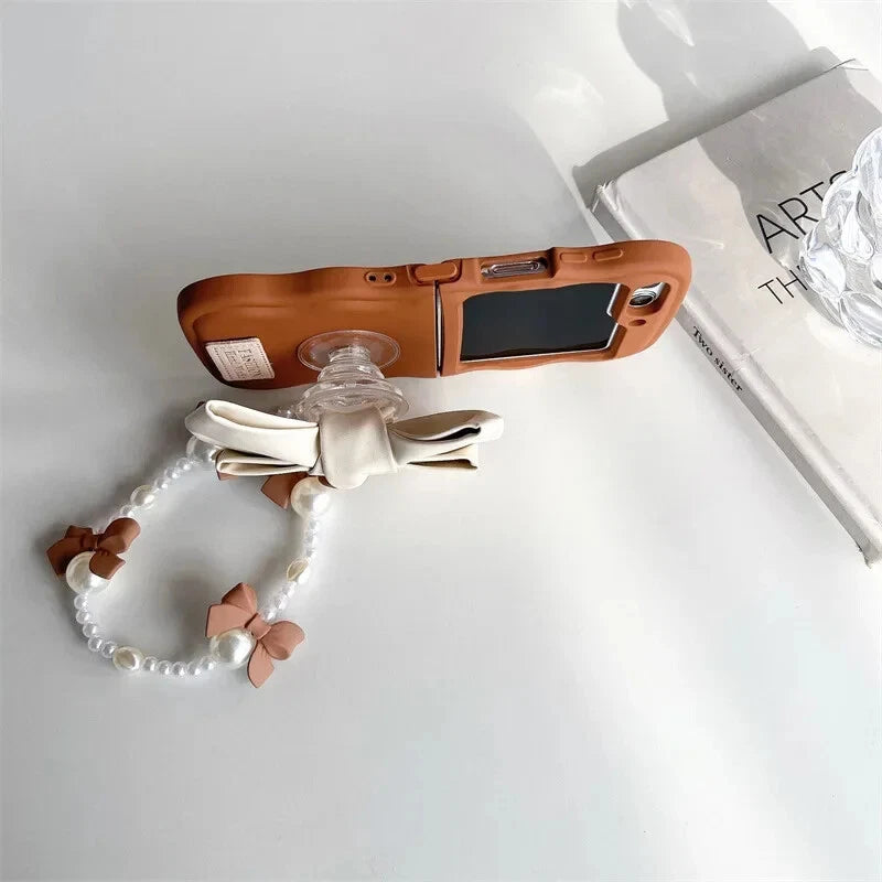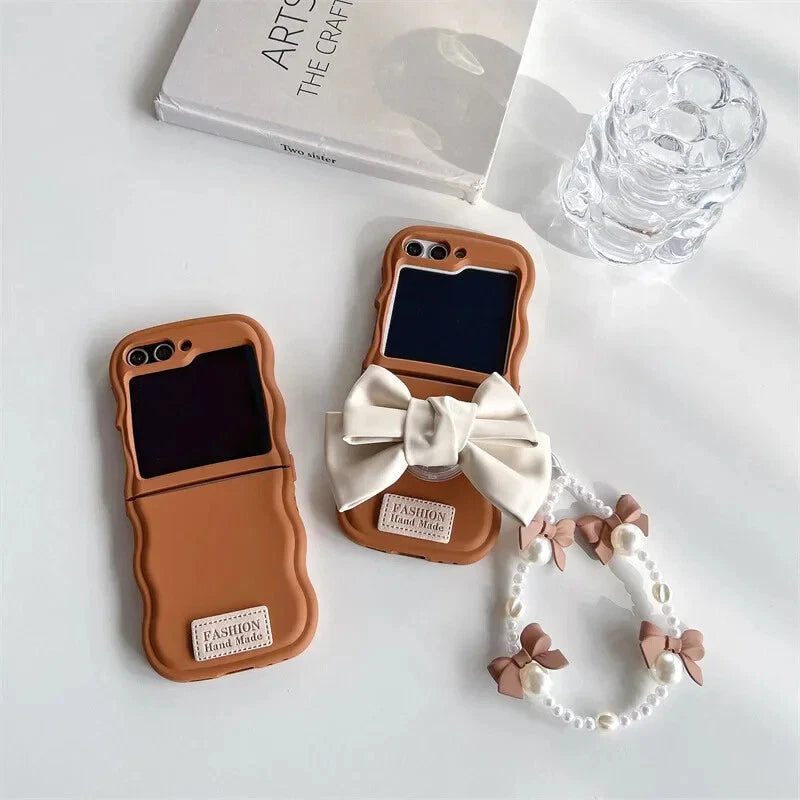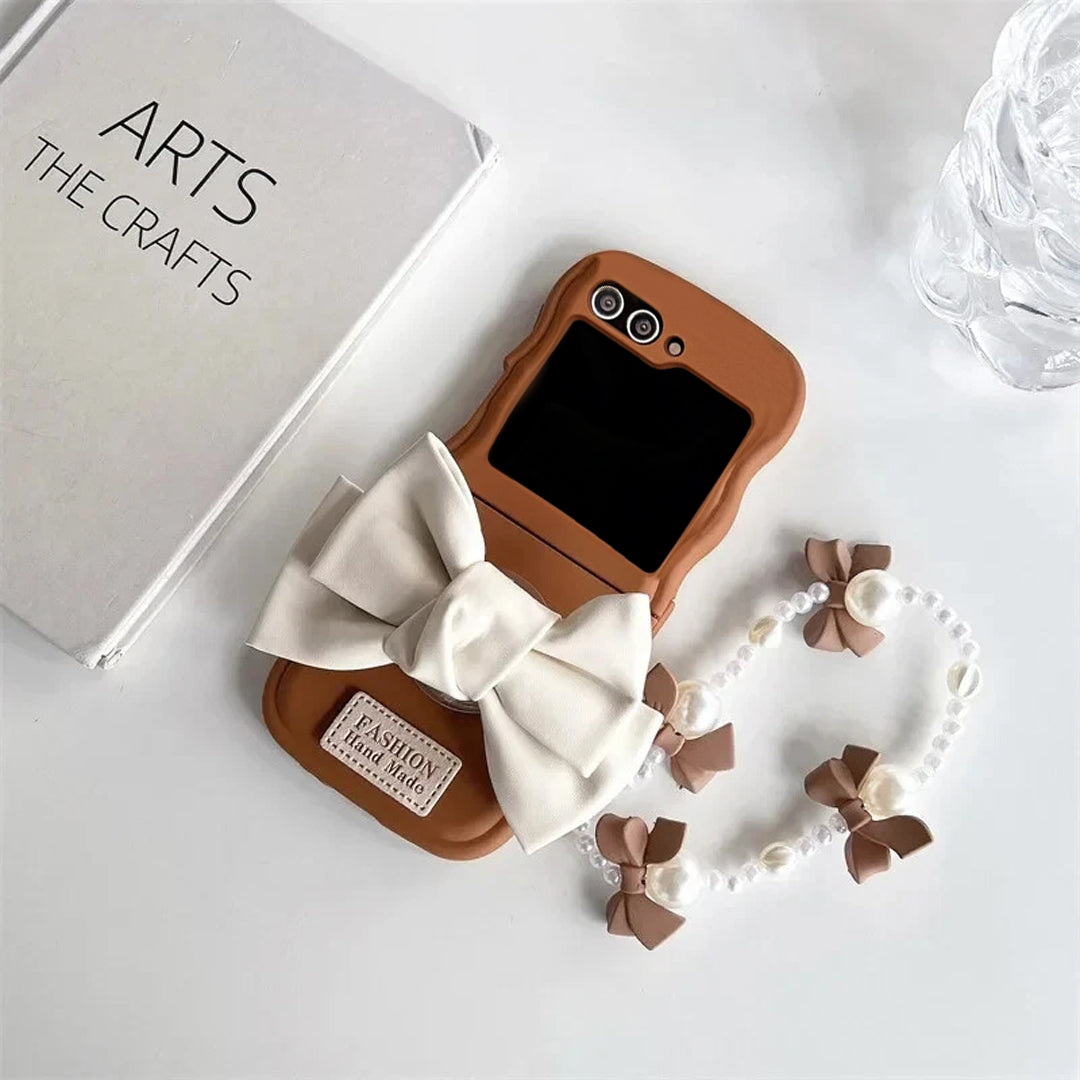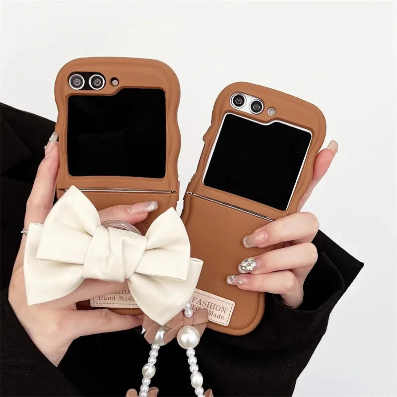 Dress your folding phone in chic, girly charm! This soft faux-leather flip case features a lovely ribbon bow accent and an elegant pearl strap for the perfect combination of cute and classy. Protect your device with a dash of feminine flair and elevate your everyday style.
