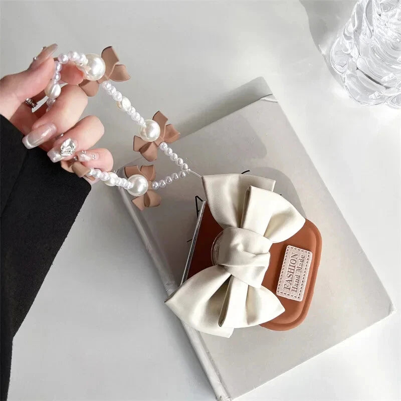 Details: Ribbon bow, pearl charm strap