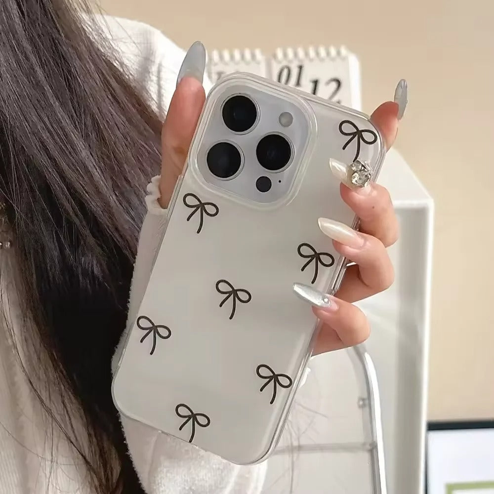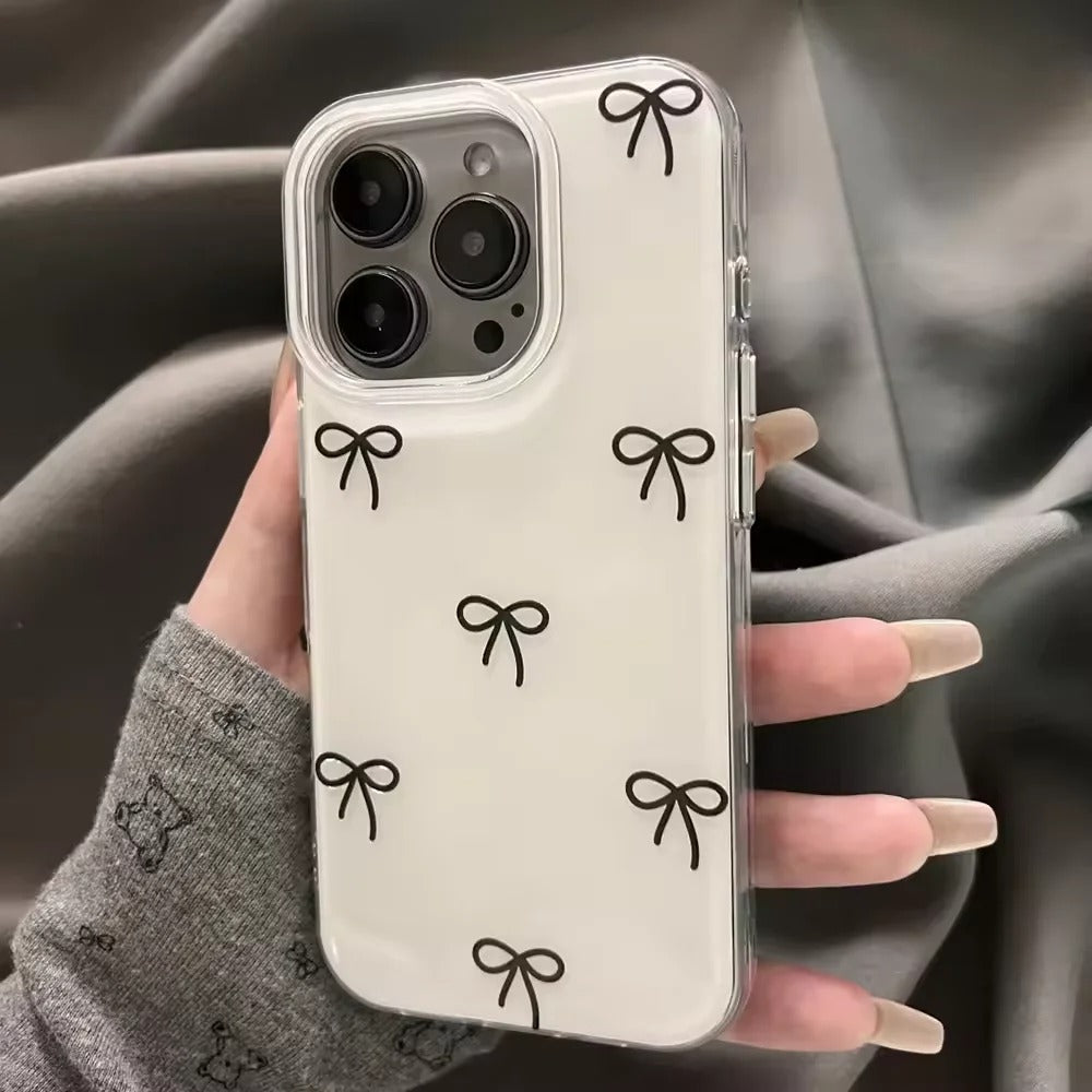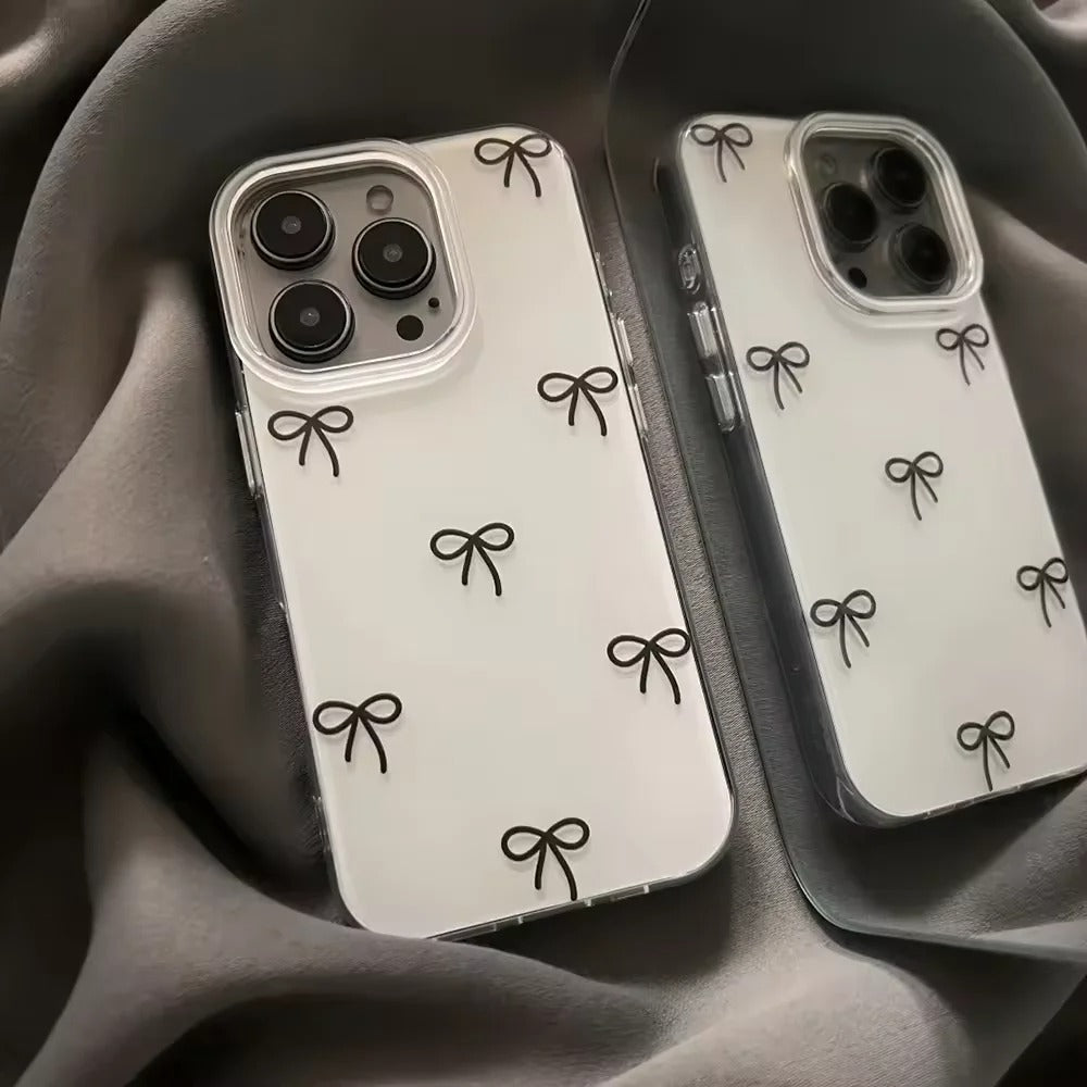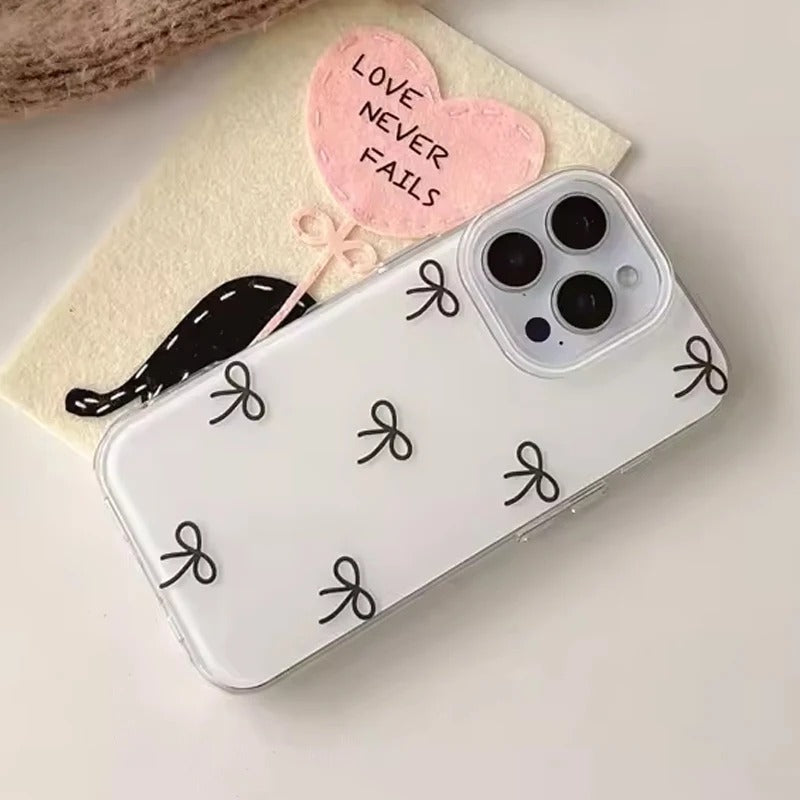 Minimalist Bow Print: Hand-drawn black bows scattered over a clear back with white or pink inset