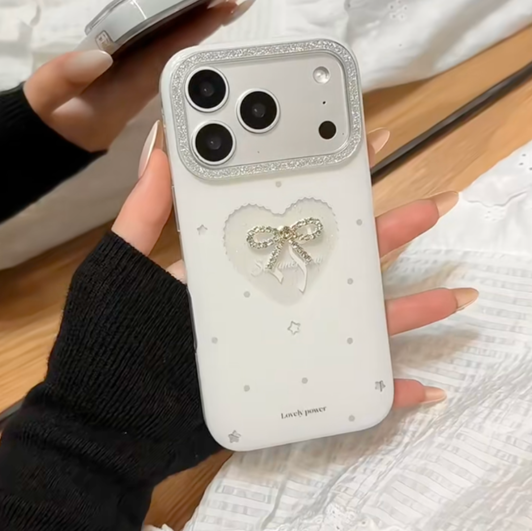 Add a touch of sparkle to your phone with this Cute Bling Bow Heart Case! Designed with an adorable heart and bow centerpiece, this case shines from every angle. The crystal-decorated camera frame adds extra glamour, while the durable hard shell keeps your phone safe from bumps and scratches. Perfect for anyone who loves girly, glittery, and stylish accessories!