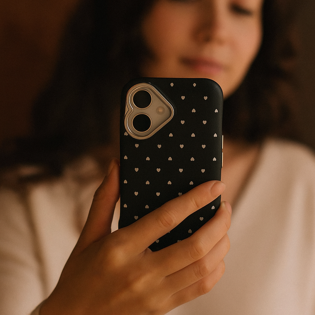 Fall in love with everyday protection: the Dotted Heart Case in black is dotted with hand-drawn white mini hearts for a touch of whimsical charm. Crafted from a soft-touch PU leather exterior and a shock-absorbing TPU core, it wraps your iPhone in sleek style while guarding against drops and scratches. The precision-cut triangular camera surround is finished in matching brown with raised edges to protect your lenses. Slim-fit and pocket-friendly, this case combines playful patterning with reliable defense.