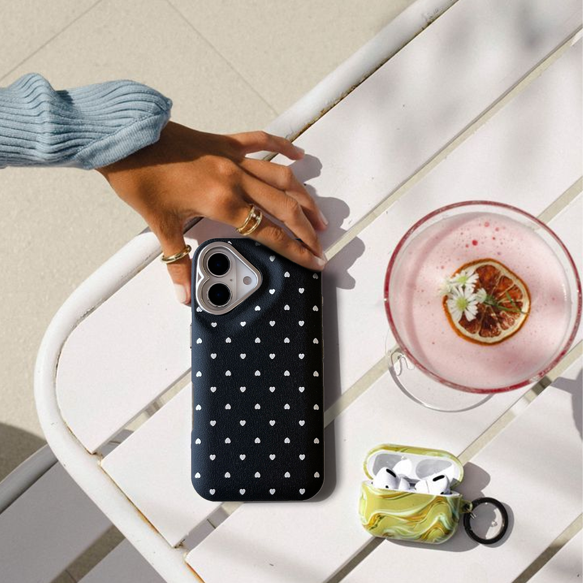 Embrace a sweet, stylish look with the Dotted Heart Case—where fashion meets function in every little detail.