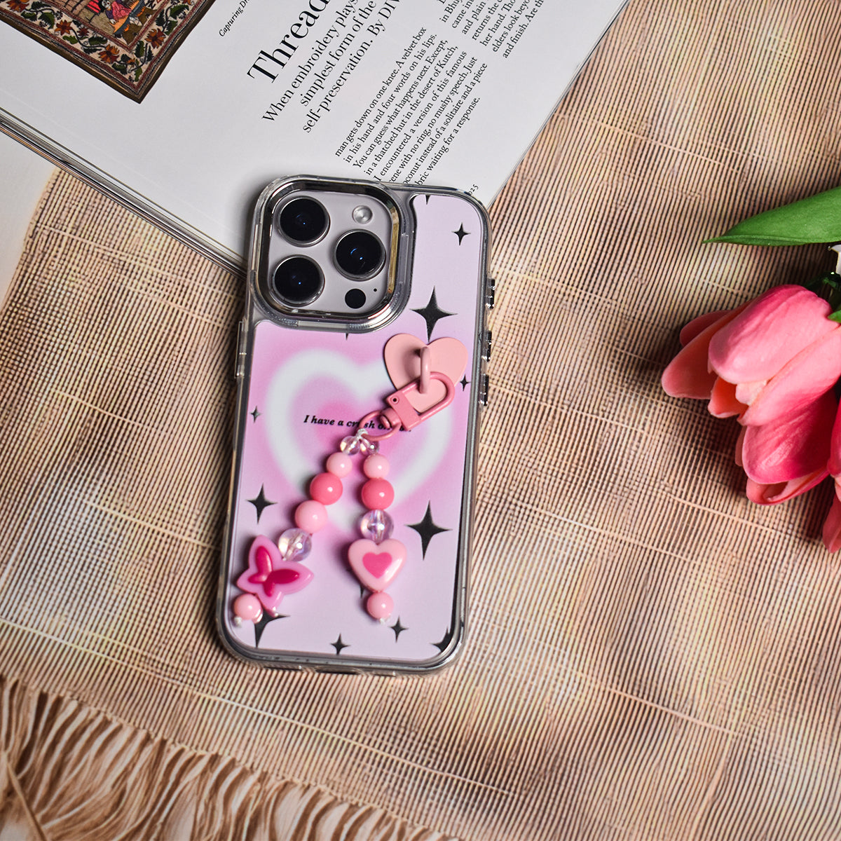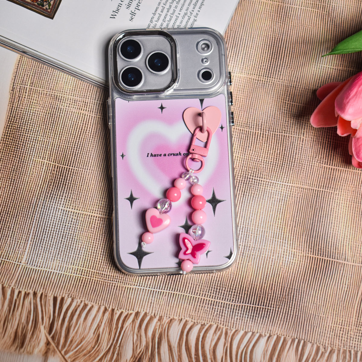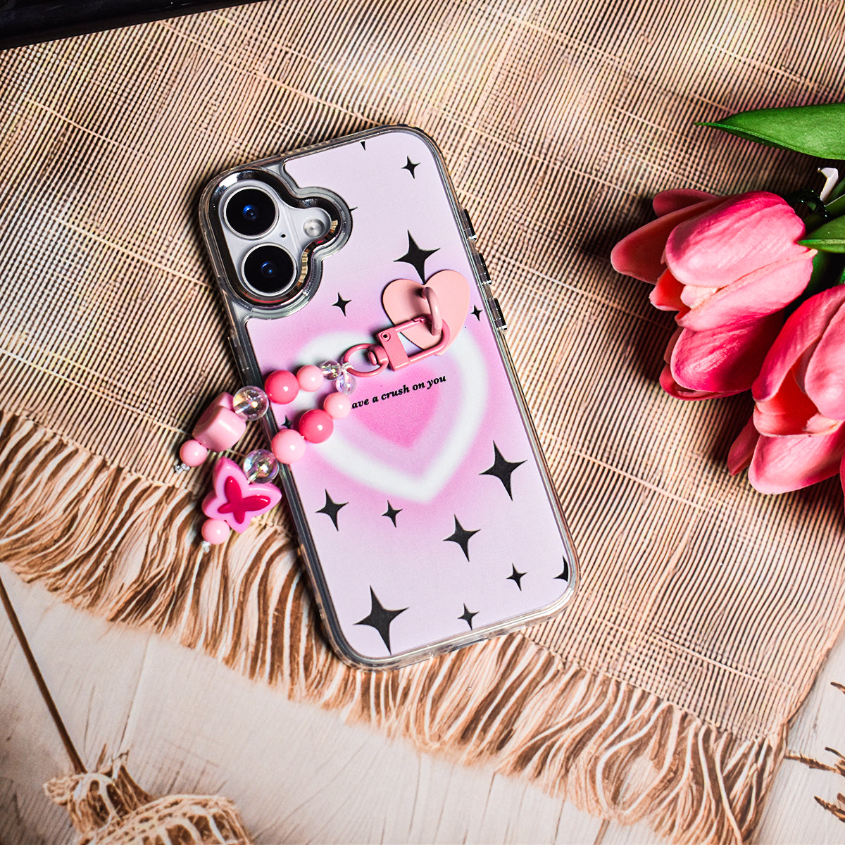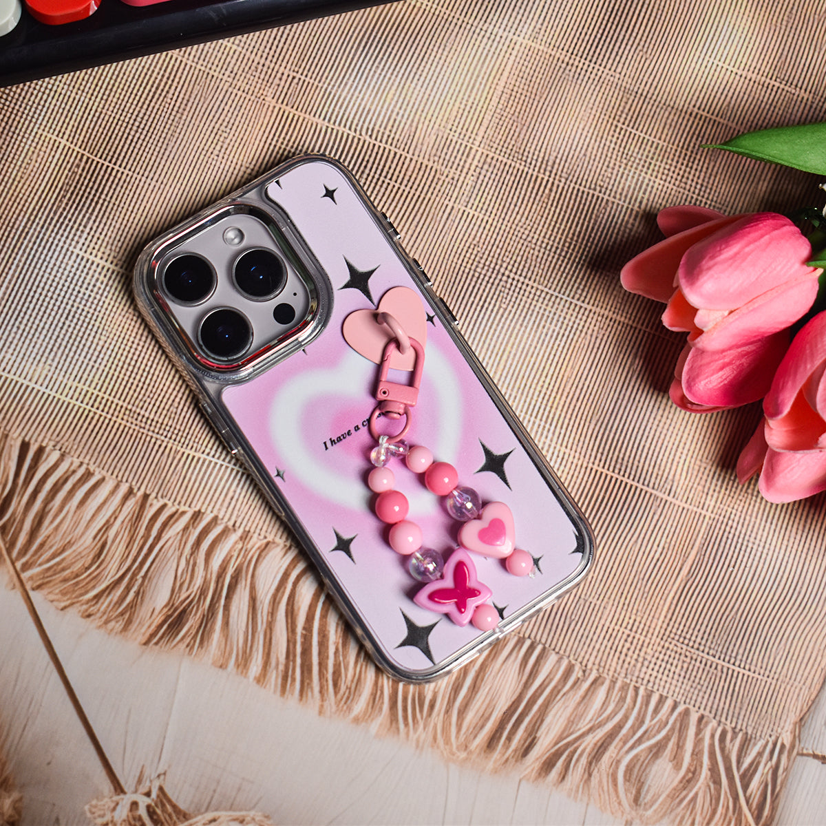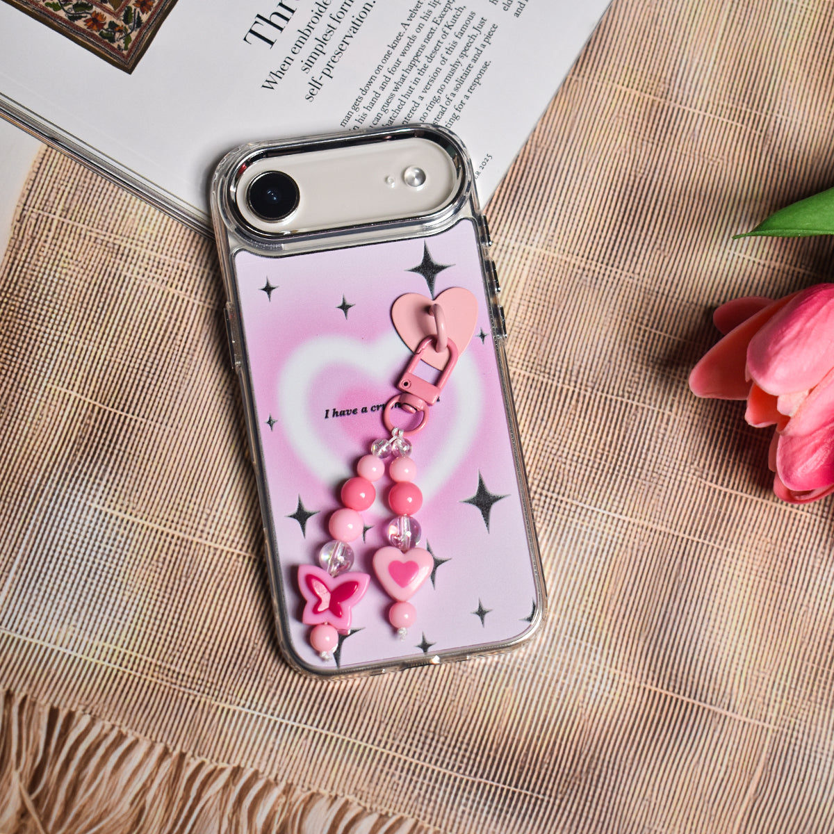 Made from flexible, durable TPU, it's both stylish and protective. The case also comes with a matching beaded charm, complete with heart and butterfly beads, for that extra touch of kawaii charm.
