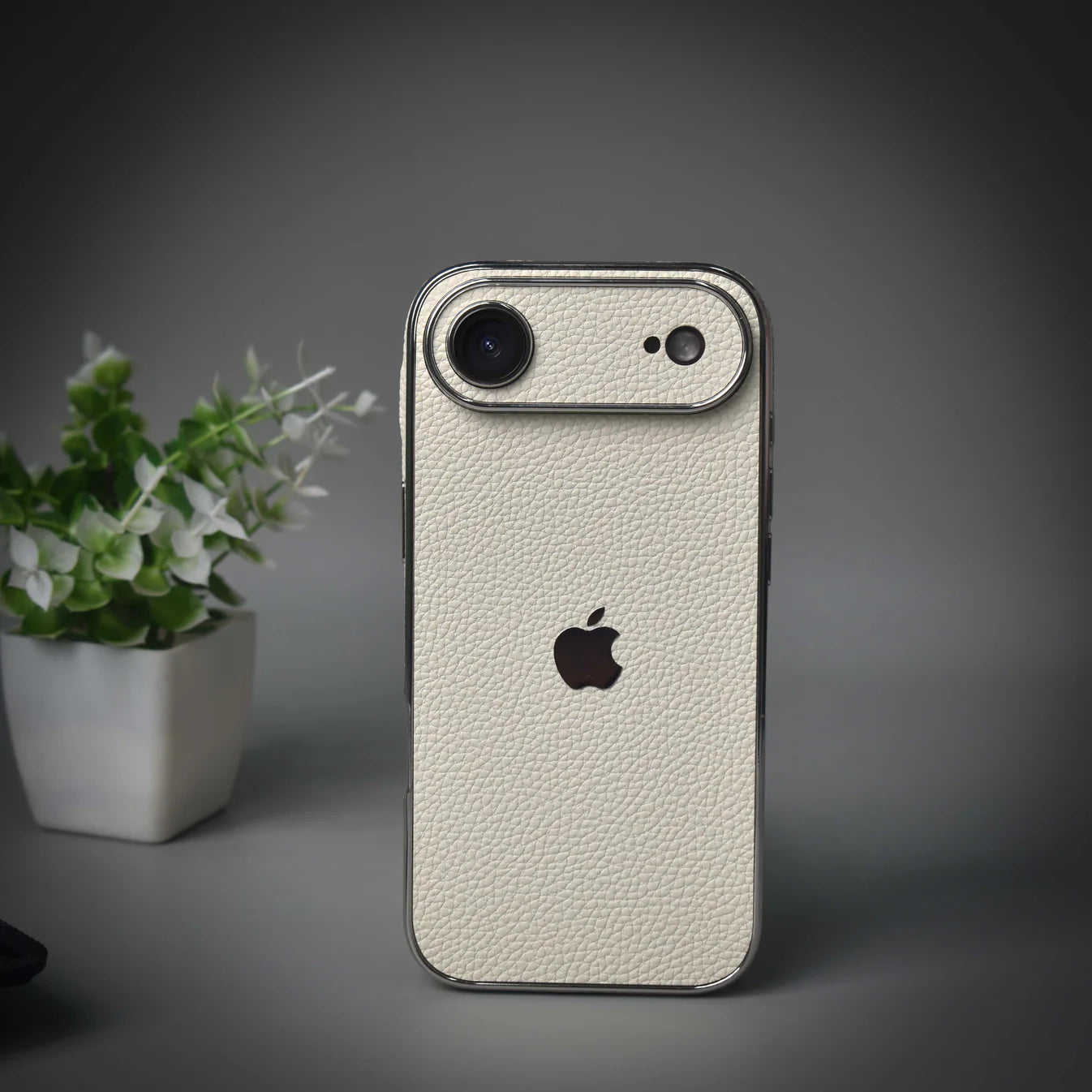 Wrap your iPhone in sophistication with this ivory pebbled leather case. Designed to impress, it offers a flawless blend of style and protection. With a soft-touch feel and chrome-finish edges, this case turns every glance into admiration. Subtle, sleek, and seriously stunning.