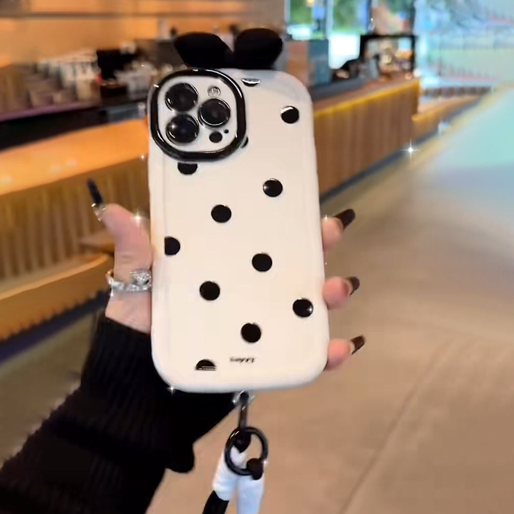 Designed for girls who love classy yet playful vibes, this case features a soft polka dot pattern, a 3D bow accent, and a detachable wrist strap for a comfy and secure grip.